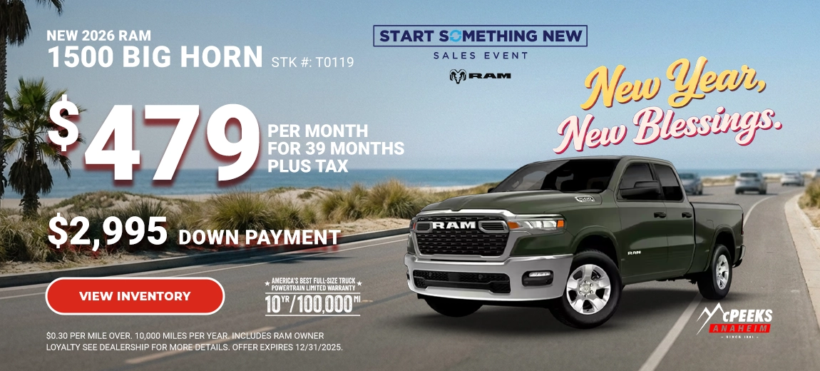 Don’t wait to claim new car specials, available at McPeek’s Chrysler Dodge Jeep Ram of Anaheim, so you can save big on your purchase. Between savings opportunities on commercial trucks and great Dodge lease offers, you can get the vehicle you need at a price you’re thrilled with. Turn to our Chrysler and Ram dealership in Anaheim to see what new vehicle specials we’re running today!